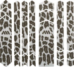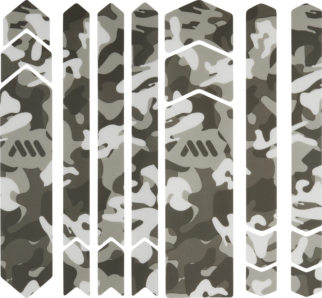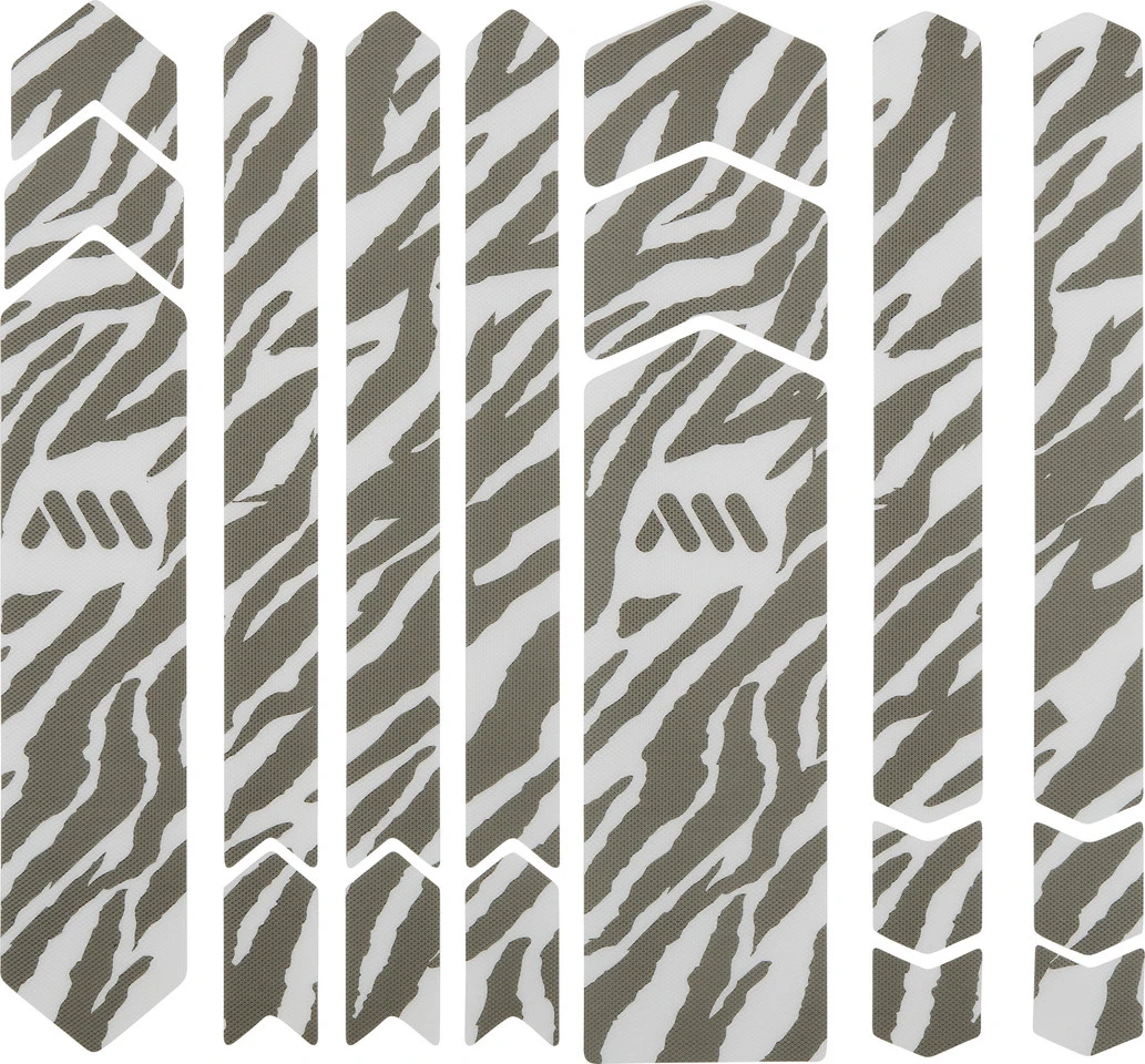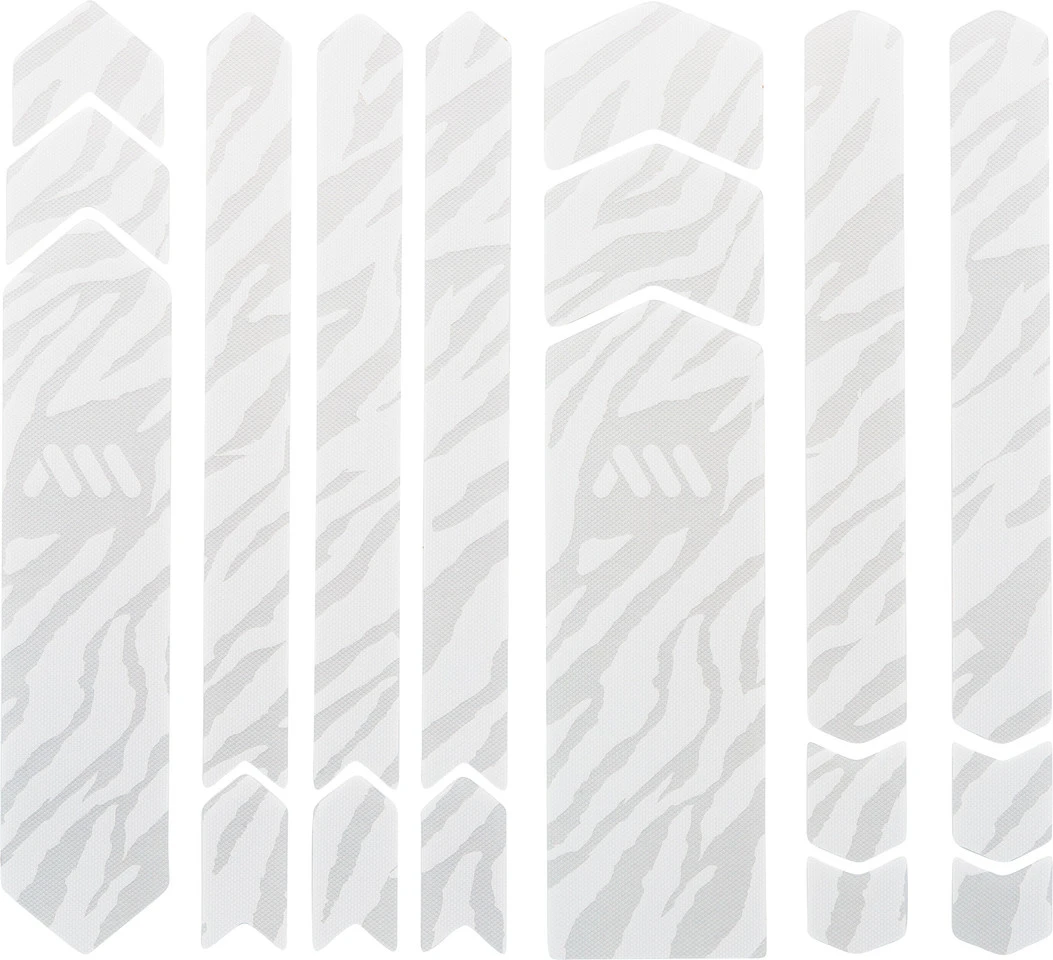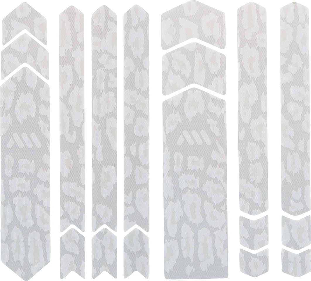 Características:sistema universal de protección del cuadro que consta de 8 piezas: tubo inferior, tubo inferior lateral, tubo superior, vainas y flechas para la extensión y contra el desgaste de los cablestu solución si quieres una protección total para tu bicicleta de montaña o de descensoevita los daños y la abrasión de los cables en el cuadroel PVC semirrígido en forma de panal de 380 micrómetros ofrece una gran resistencia a los impactos y a la abrasión con un peso mínimo (48 gramos)materiales que no se ponen amarillos con el tiempomontaje sencillo y universal, incluso en ángulos difícilesNúmeros de fabricante:camo:AMSFG5CLCMclear:AMSFG5CLSVsuper rider black:AMSFG5SRBKzebra grey:AMSFG5ZBGYzebra white:AMSFG5ZBWHcheetah grey:AMSFG5CHGYcheetah white:AMSFG5CHWHInformación sobre el color:camo:transparente, gris con patrón de camuflajesuper rider black:transparente, negro con elementos de MTBzebra grey:transparente, gris con dibujo de cebrawhite zebra:transparente, blanco con dibujo de cebracheetah grey:transparente, gris con dibujo de Cheetahcheetah white:transparente, blanco con dibujo de CheetahVolumen de envío:1 x Set de calcomanías de protección de cuadros All Mountain Style Frame Guard Full