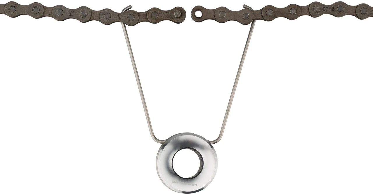 El soporte de cadena de Birzman facilita el montaje de la cadena. Simplemente se engancha en la cadena abierta y la cadena se puede montar sin tensión.