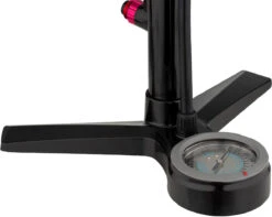 La bomba de pie de aluminio de 3min19sec. es muy llamativa y suministra presiones de hasta 16 bar. Tiene un mango de madera que encaja bien en la mano siendo un complemento bonito del aluminio negro. El cabezal de la válvula giratoria se ajusta a las válvulas Presta, Schrader y Dunlop con una buena fijación al bombear. Además, un manómetro de 60 mm fácil de leer, incrustado en la base ayuda a conseguir la presión correcta. La práctica válvula de escape en el cabezal de la bomba es adecuada para ajustes finos.