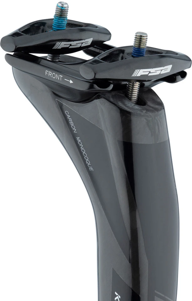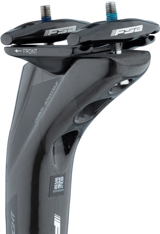 La tija de sillín K-Force SB25 MTC Carbon de FSA tiene un Setback de 25 mm, se basa en una construcción de una sola pieza que ahorra peso y viene con una cabeza de sujeción de aluminio plana y fácilmente ajustable.