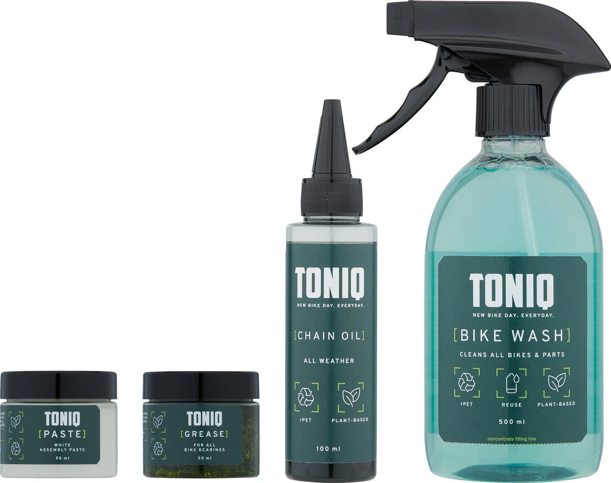 1 x Limpiador de bicicletas TONIQ Bike Wash 500 ml1 x Pasta de montaje TONIQ Assembly Paste 50 ml1 x Grasa para rodamientos TONIQ Bearing Grease 50 ml1 x Aceite para cadenas TONIQ Chain Oil 100 ml