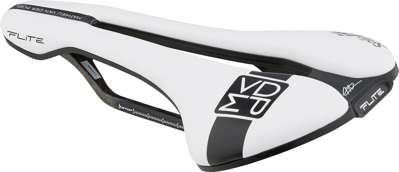 La edición MVDP de la versión Superflow del kit Flite Boost de Selle Italia es un sillín de ruta de alto rendimiento en honor al ciclista profesional Mathieu van der Poel. Dispone de una muesca para aliviar la presión, raíles de carbono y ofrece un ajuste plano.