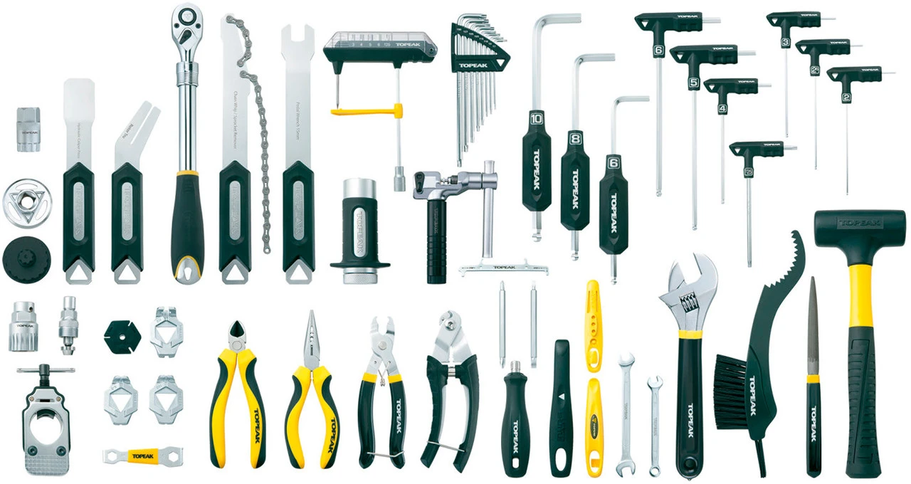 Carraca extensible 1/2″ Drive Extendable Ratchet, carraca extensible – mecanismo de 72 dientesAccesorio de inserción de ejes de pedalier External Bottom Bracket ToolFreewheel Remover, compatible con cassettes Shimano, SRAM y otrosAccesorio de inserción de ejes de pedalier Cartridge Bottom Bracket Tool: BSA, Octalink, ISIS DriveChain Whip/Sprocket Remover: latiguillo de cadena / extractor de anillo de bloqueo y de rueda libreHydraulic Caliper Press: herramienta de ajuste para todos las pastillas de freno de discoLlave de pedales Pedal Wrench 15 mmHerramienta de centrado RotorTru para discos de frenoUniversal Crank Puller cuadrado, Octalink, ISIS Drive