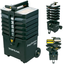 Los siete compartimentos del cofre de herramientas con ruedas PrepStation Pro de Topeak están llenos de un juego de herramientas profesionales de 55 piezas de calidad de taller. Lo más destacado es el nuevo compartimento magnético adicional y el Bucket Seat.